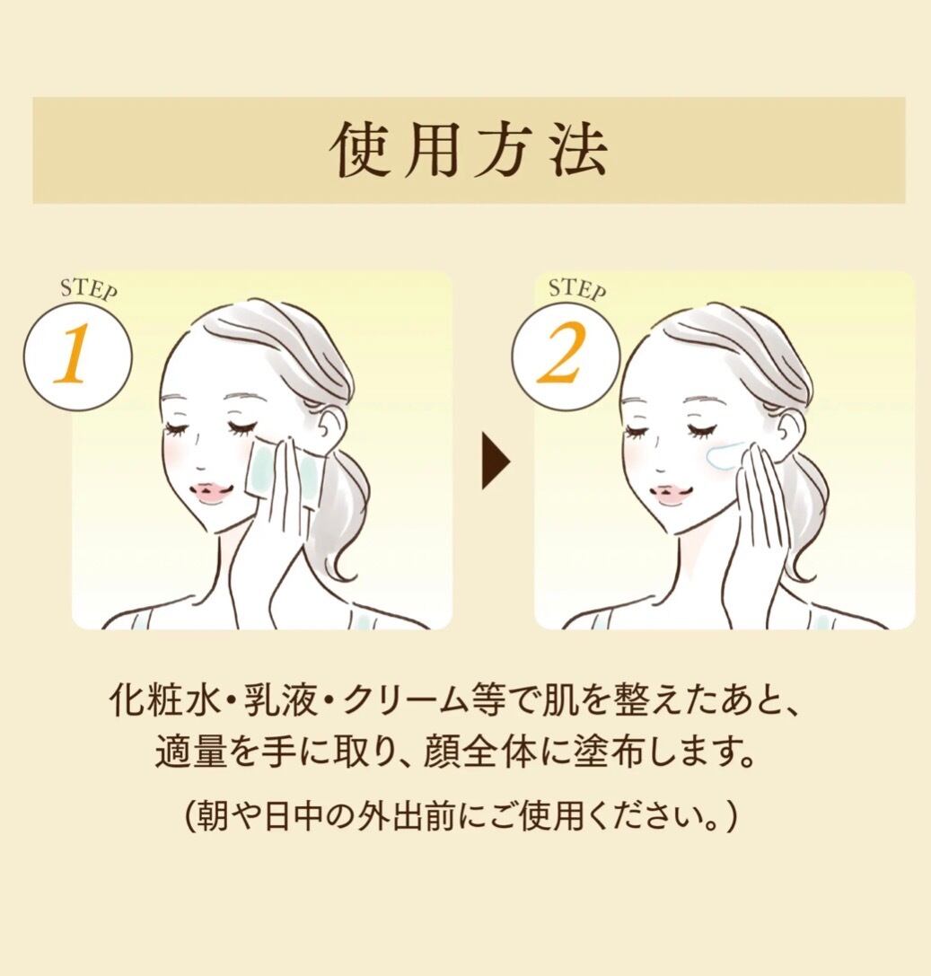 朝のスキンケアの最後に適量を手に取り、顔全体に均一に伸ばします。その後、いつものメイクを施してください。